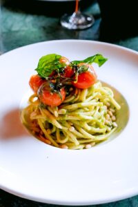 19€Linguini, pesto maison, tomates cerises rôties, pignons de pin